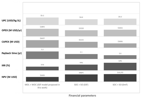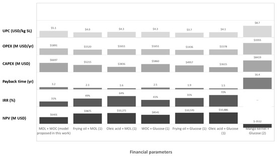 In Figure 4, financial parameters obtained for the different substrates reported by [41] (frying oil-MOL, oleic acid-MOL, WOC-glucose, frying oil-glucose, and oleic acid-glucose), and by [25] (mango kernel-glucose), are presented. Results indicate that UPC values are in the range of 3.7 to 4.3 USD/kg SL, up to 16% lower than those obtained in our model with WOC and MOL. These authors indicated higher yields for all the conditions tested compared with those obtained in this work, in which SL production yields using frying oil and glucose as the substrates were nearly 30% higher, while using oleic acid and glucose gave almost twice the yield obtained by fermenting WOC and MOL. Even when the conditions presented by the authors were not optimized for industrial or semi-industrial processes, they gave us a preliminary vision of the financial impact of changing substrates from residues (WOC, frying oil, and MOL) to raw materials (oleic acid and glucose). Using pure substrates implies higher yields and also higher substrates costs that affect UPC in opposite ways.