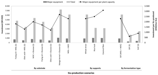 As stated above, UPCs for SL for the three scenarios are higher than the commonly used petroleum-based surfactants, 1 to 4 USD/kg for synthetic surfactants, such as sodium dodecyl sulphate [51]. However, is it necessary to compare the cost for a product obtained in a bioeconomy framework to its petroleum-based analogue? From a systemic point of view, the answer to this question should be “no”. Indeed, besides cost, the answer should integrate environmental impact, land use, water consumption, labor qualification, etc. [52] to account fairly for the advantages of the bioeconomy. On the contrary, it is fair to compare the proposed process to the production of SL through submerged fermentation.