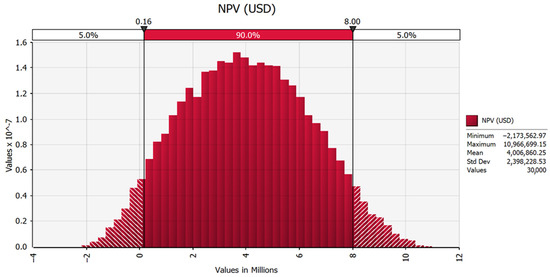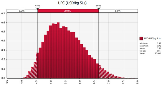 Figure 7 and Figure 8 present the results for the sensitivity analysis on the net present value (NPV) and unit production cost (UPC), respectively. Under the assumptions made in this study (Table 4), NPV could range between −2.1 and 10.9 MM USD, with an average value of 4 MM USD. The combined effect of multiple variables in a worst-case scenario would eventually lead to a negative NPV value. However, positive values in the range of 1 to 8 MM USD are expected with 90% of probability. UPC values may vary from 3.97 to 7.91 USD/kg SL, with an average value of 5.51 USD/kg SL.