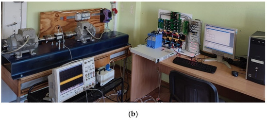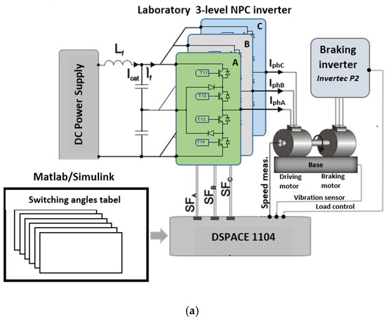 The simulation tests were validated by performing real experiments on a laboratory stand equipped with a three-level NPC inverter with a CPLD system, laboratory power supply, dSpace 1104 card, PC, induction motor with load, industrial inverter, and ICP603C01 accelerometer. The block diagram of the stand and photograph is depicted in Figure 2a,b.