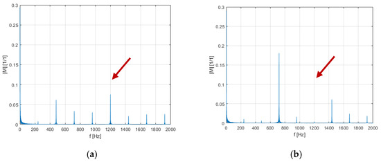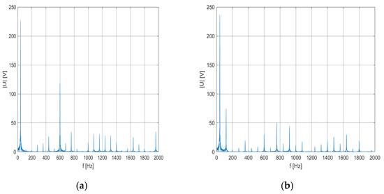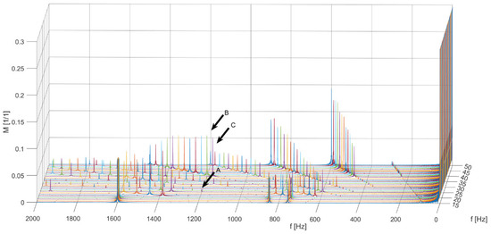 The tests were carried out separately for the first harmonic frequencies of the motor supply voltage in the range of 5–50 Hz. For the testing, an assumption was made for each operating point that it is a fixed work point. The values of the modulation coefficient were selected in accordance with the assumption of ensuring a constant flux, i.e., U/f for the frequency of 20–50 Hz. For the frequency of 5–19 Hz, the system operates with a constant switching frequency of 800 Hz. Arrows A, B, and C indicate undesirable harmonic components with a frequency of 1200 Hz for 25, 40, and 50 Hz, respectively, i.e., the frequency of the first harmonic voltage wave.