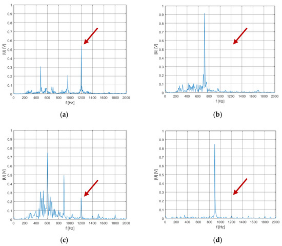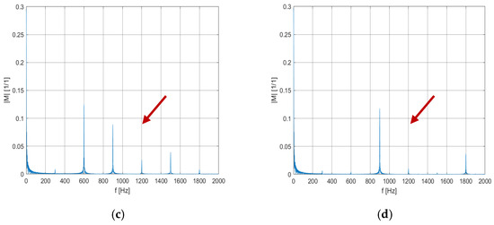 The waveforms shown illustrate the frequency spectra of the propulsion unit vibrations for the SCPWM and SHE methods. The frequencies of 40 and 50 Hz were chosen because their spectra for SCPWM modulation contained the highest harmonic component values of 1200 Hz. The obtained results show high efficiency in eliminating the selected vibration frequency of 1200 Hz. On all spectral graphs, a high correspondence of the harmonic components for the recorded vibration signal with the harmonic waveforms of the torque obtained by simulation can be observed (comparison of Figure 4a–d and Figure 7a–d), further proving the correctness of modeling phenomena in the simulation program and the proper performance of real research. Taking into account the waveforms presented in Figure 7a–d, the damping factor for 1200 Hz harmonic equals 23.2 for the fundamental frequency of 40 Hz and 12.1 for the fundamental frequency of 50 Hz. This significant improvement allows the avoidance of mechanical resonance that could lead to drive system failure.