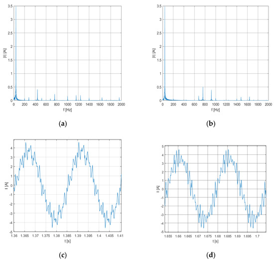 Comparison of the line current waveform and spectrum of harmonics for the fundamental frequency of 40 Hz: (a,c) SCPWM method; (b,d) SHE method.