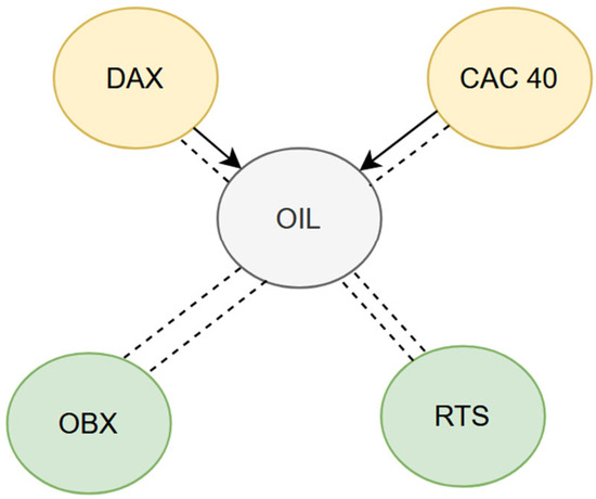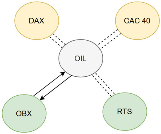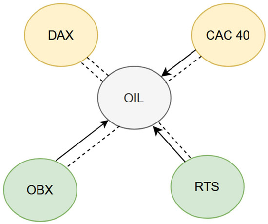 Figure 4. It is shown that crude oil does not Granger-cause the CAC 40 index and DAX index, the stock indices from oil-importing countries (France and Germany), for any of the three sub-periods. On the other hand, it is shown that the CAC 40 index and DAX index Granger-cause oil during the COVID-19 outbreak. In addition, the CAC 40 index exhibits the same behavior during the period after the invention of the vaccine. Regarding oil-exporting countries, the same results are presented for Russia and crude oil related to Granger causality from crude oil to the RTS Index. In particular, crude oil does not Granger-cause the RTS index, for any of the sub-periods, whereas it is noticeable that the RTS index Granger-causes crude oil during the period after the creation of the vaccine. Last but not least, regarding the OBX index of Norway and crude oil, we can see a two-way Granger causality during the period before the COVID-19 outbreak but there is no causality during the high-volatile period. Finally, it is shown that the OBX index Granger-causes crude oil during the period after the development of a vaccine. Regarding the Granger causality tests, the results for the three sub-periods are presented on