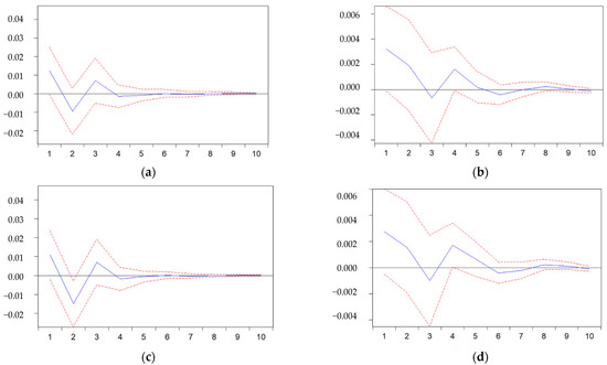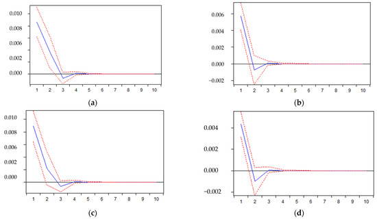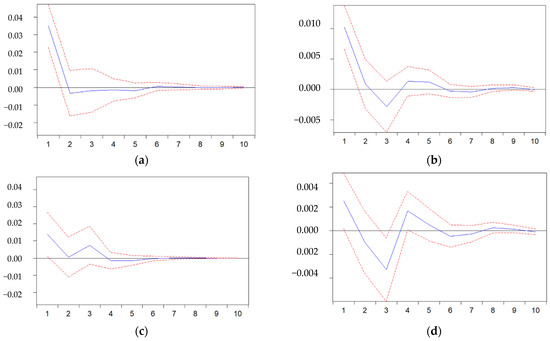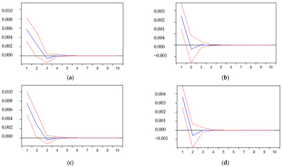 The response of the selected variable, indicated in logged first differences, to a positive one standard deviation shock in each of our explanatory variables is also assessed. The impulse response function confirms the dynamic response of this shock on the volatility variable at a 95% confidence interval. Hence, one period refers to one trading day, as is shown on the x-axis, whereas the y-axis presents the logged first difference of the dependent variable. The impulse corresponds to a one standard deviation shock on the residuals that are affected by the shock, which in this case is an innovation. The solid line corresponds to the response, and the dashed lines indicate a 95% confidence interval of the response. All variables are log converted and in the following graphic presentations, we are looking for significance in the impact of each variable’s shock for the three sub-periods, including the pre-vaccine and the post-vaccine period, and the significant impact is present when the confidence interval does not include the zero value. The impulse response converges to zero as time passes, straight after period 10 in all impulse response functions.
