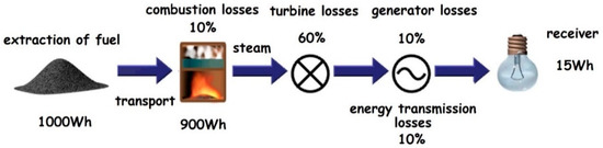 Martenson, in [36], stated that power losses during the extraction, transformation and transmission of energy, and in the receiver itself, account for over 90% of primary energy, and the combustion of non-renewable fossil fuels is a source of environmental pollution. Figure 1 shows an example of a chain of energy transformations from fuel extraction to obtaining energy in a simple, common and necessary everyday-life receiver: a light bulb. From one kilowatt hour of fossil fuel, several dozen watt hours of light energy can be obtained.