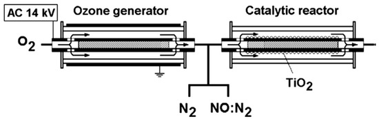 - Osawa, N.; Suetomi, T.; Hafuka, Y.; Tsuha, K.; Yoshioka, Y.; Hanaoka, R. Investigation on reactor configuration of nonthermal plasma catalytic hybrid method for NOx removal of diesel engine exhaust. Int. J. Plasma Environ. Sci. Technol. 2012, 6, 119–124. [Google Scholar]