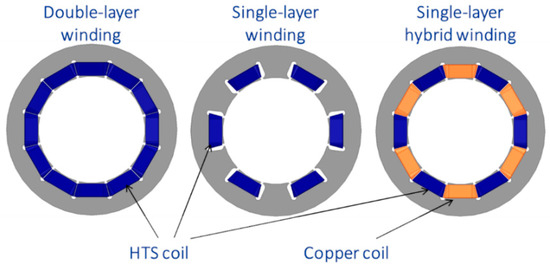 - Lasek, P.; Habelok, K.; Stepien, M. Armature winding analysis for high-temperature superconducting PM-excited AC machines. Int. J. Appl. Electromagn. Mech. 2020, 64, S269–S278. [Google Scholar] [CrossRef]