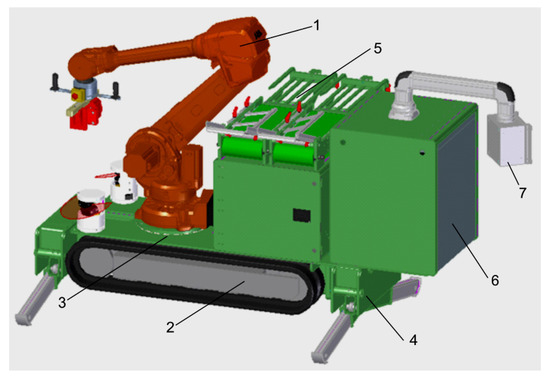 The RBS consists of a six degrees-of-freedom (6-DoF) ABB bricklaying robot (IRB 4600) with a replaceable hydraulic gripper, a Hinowa tracked undercarriage with a hydraulic unit, an RBS, an HLL module, a brick warehouse, a brick feeder, a mortar applicator, a control cabinet, and a control panel. Before starting work, the mobile RBS travels to the bricklaying site and is then lifted, leveled, and anchored. Bricklaying begins with the precise positioning of the robot according to the wall plan using laser sensors. The bricklaying robot has a weight of 450 kg, a gripper load of 40 kg, a maximum vertical range of 3.055 m, and a maximum horizontal range of 2.55 m.