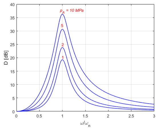 Mathematical transform of the impedance of the damping valve and the impedance of the hydraulic accumulator circuit into the damping efficiency index D(ω) as a quality index (see Equation (34)). The damping efficiency indicators as a function of the frequency ratio are used in the selection of the parameters of the SHA-HSD system due to the effectiveness of pressure shock damping.