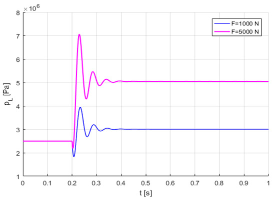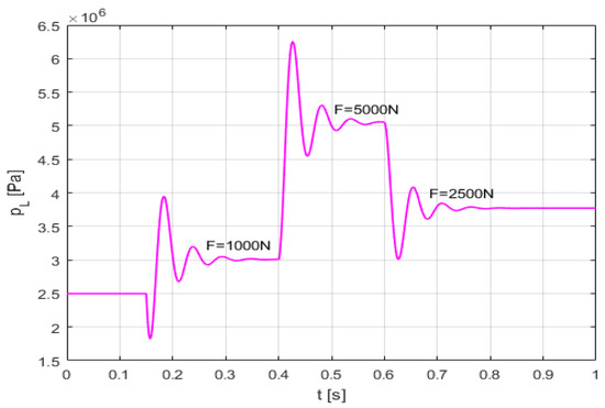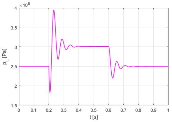 The SHA consists of a hydraulic lift actuator (double-acting with one-sided piston rod) with an internal magnetostrictive linear position transducer, a 4WRE proportional directional valve, directly operated with position feedback and integrated control electronics (ICEs). The parameters of a hydraulic lift actuator are the diameter of the piston D = 0.05 m, the diameter of the piston rod d = 0.028 m, area ratio α = 0.69, stroke h = 1.25 m, and working pressure p = 25 MPa. Technical data of the 4/3 proportional directional valve: nominal volumetric flow rate qvn = 35 L/min (0.583 × 10−3 m3s−1) at a pressure difference of Δpn = 1 MPa. An adjustable HSD consists of a 2-way proportional throttling valve, where a damping valve dissipates shock energy, a hydropneumatic accumulator absorb pressure shock, and a pressure transducer. The proportional throttle valve consists of the main valve with a nominal N25 orifice and the pilot control valve with a proportional solenoid. The flow through the valve depends on the pressure drop Δp across the orifice and the position of the orifice spool z, and the command value u = 0–10 V. The maximum operating pressure of the valve was 31.5 MPa and the maximum flow rate of the operating fluid was 38 L/min (0.63 × 10−3 m3s−1). The flow resistance of the damping valve is adjusted by the voltage of the proportional solenoid coil. The shift of the valve spool is proportional to the coil voltage, increasing or decreasing the flow resistance. In an applied diaphragm accumulator with a nominal volume of 1 L (0.001 m3) and permission pressure ratio 10:1, a flexible diaphragm separates the compressible gas cushion from the working hydraulic fluid. Hydropneumatic accumulators are based on the principle of using nitrogen as a compressible medium. When a proportional damping valve is placed between the hydraulic actuator and the accumulator, an adjustable damping is achieved, which occurs in semiactive shock absorbers. Hydraulic accumulators up to a nominal volume of 2 L can be screwed directly into the connecting tube. An HSD can be fabricated in size and form suitable for installation near the SHA or a master actuator.