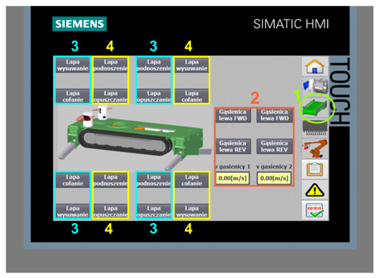 The experimental study was carried out on a demonstration RBS in laboratory conditions, because it would not be possible to reproduce the shock loads of the brick-laying robot during bricklaying on the test stand. The tests were carried out in various working positions of the bricklaying robot. The tests started with the correct positions of the robot, which required steering the track undercarriage as well as lifting and leveling the RBS. The RBS control system was based on the Simatic HMI (Siemens) operator panel, which consists of several touch screens that can be activated with the appropriate buttons. From the start screen, the touch screen shown in