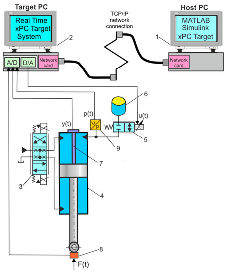 To test the SHA-HSD system, a distributed measurement and control system was used, which consists of the Target PC and the Host PC, where the first PC was the direct control layer, while the second PC acted as the supervisory operator of the control layer. The Host PC and the Target PC communicated with each other via TCP/IP. The computers ran Windows with the MATLAB/Simulink software package. The Target PC had the measurement card (DAS1602 /16–Measurement Computing Corporation) and the Real-Time xPC Target system which was used for measurement data acquisition and control of the damping valve. Simulink, Real-Time Workshop @ and xPC Tar-get software were installed on the host PC. Real-time measurement and control was based on the LQR controller implemented in the Target PC. The measuring transducers were connected to the Target PC via the measuring card. Due to xPC Target Spy software, it is possible to visualize the processed measurement data. The schematic diagram of the distributed measurement and control systems is shown in
