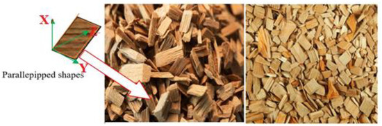 In most cases, the challenge in adopting the pyrolysis method to generate energy and biocharcoal is the cost of building the plant, which first requires the study of operating parameters [14]. These parameters are usually generated through costly experimental studies. The setback is that the data required for optimization purposes are limited in the literature for different biomass compositions. Nevertheless, the advent of different computational software has presented powerful tools to numerically simulate all operational conditions, which can be brought to reality in physical designs of pyrolysis [15]. Several numerical simulation studies for biomass including wood chips are available in the literature [16,17]. Successful modeling of the process depends on knowledge of the reaction scheme, which is a complex process. This reaction scheme depends on the mechanism of the heat and mass transfer between the reactor and the product. The dynamics of heat flux surrounding the wood chips, as heat is transferred from the surface to the core, are related to their shape [18,19]. Investigating some possible shapes of wood chips, the authors of [18,19] showed that the pyrolysis duration and the final mass fraction are shape dependent. The intra-particle structural dynamics of the wood chips are also affected by the shapes. The shape of the biomass during pyrolysis can lead to differences in the characteristic length of the transport phenomenon for heat and mass transfer [20]. However, the authors of [18] simplified their choice of shapes for ease of numerical simulations. Considering the effect of the shape of wood chips on heat and mass transport phenomenon and product yield, Atreya et al. [19] studied cuboids, cylinders, and spherical shapes. They found that the duration for completion of the pyrolysis processes, mass loss measurement, iso-surface for internal pressure, and heat generation was highest for spheres and lowest for cubic shapes, and that these measures are affected by the shortest distance for heat and mass transfer. Okekunle et al. [18] considered cylindrical, rectangular, equant, and disc-shaped wood chips in their pyrolysis studies. They observed high biochar yield for rectangular shapes at a lower temperature. Park et al. [21] considered spherical shapes and observed sample splitting due to the weakness of the structure and the generation of internal pressure. However, they suggested that moisture content, which they did not study, might have the same effects as the internal pressure and structural weakness on the wood chips during pyrolysis. Although these simplified shapes of wood chips have been studied for ease of numerical simulations, a closer observation of wood chips can present diverse shapes. In Africa and some developing countries, wood processing is still dominated by traditional semi-automatic and economical wood saw methods. As a result, it suffers from positioning errors, which include non-central alignment of saw pattern and non-parallel direction of the infeed, thus commonly producing near-parallelepiped-shaped chips [22], as shown in Figure 1.