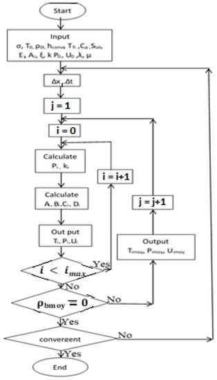 The numerical equations were solved using the finite differences method in Fortran 90, and the iteration time steps is 0.05 s, and each sample divided in 61 parts. To incorporate the geometry of the shape in the simulation, the i and j nodes indicating space and time were used to obtain convergency of the simulated results. The simulation algorithm is shown in Figure 3.