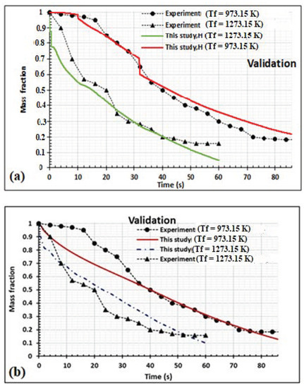 Mass validation of the model using experimental data taken from Bonnefoy et al. [38] at Tf = 973.15 K and Tf = 1273.15 K for 10 mm thick cubic samples,: (a) moisture content in the wood sample is taken into account; (b) moisture content in the wood is not taken into account.