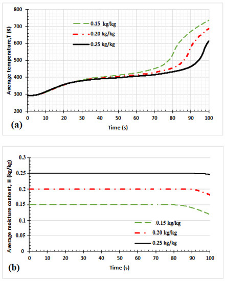 The temperature evolution is shown in Figure 5. From Figure 5a, the wood core temperature began to increase after 6 s. However, the influence of the initial moisture content on the temperature evolution of the product at the wood core was not seen until 30 s of heating. During this period, temperature propagation at the center was slow, and the reaction was endothermic, leading to high solid mass loss [21]. This corresponds to the decomposition of high volatiles like cellulose in the primary reaction scheme. After 30 s, the heating front generally increased steeply, but the dried samples with lower initial moisture content moved up rapidly compared to samples with higher moisture content. According to Park et al. [21], this exothermic reaction period is when the intermediate solids are converted to biochar. However, the difference in temperature evolution between the samples with lower moisture and those with high moisture is because some of the heat is absorbed by the moisture for evaporation in the case of samples with high moisture content. This has also been observed by Pozlon et al. [39]. Thus, the moisture content in the product decreases the kinetics of the pyrolysis process. Figure 5b shows that moisture content at the center of the product decreased after 80 s, 90 s, and 98 s for all initial temperatures. Thus, using the same energy for the process, samples with high initial moisture content have a kinetic degradation lower than those with lower initial moisture content.