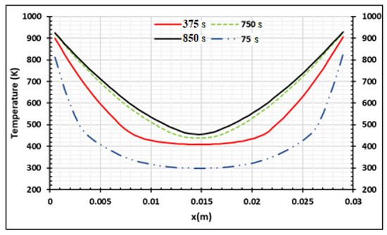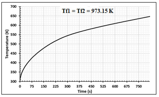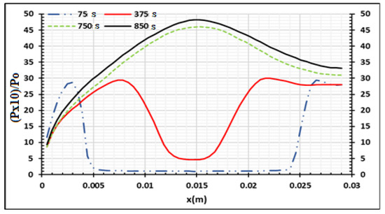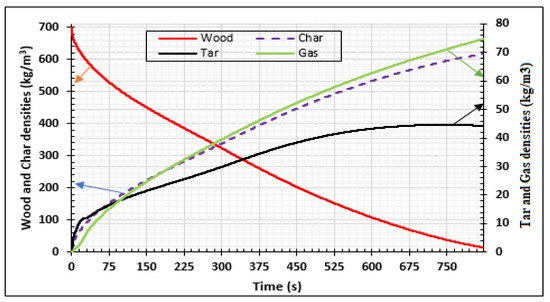 Figure 6 presents the numerical results for the densities of wood decomposed to produce charcoal, tar, and gas. The 30 mm thick samples were heated on two sides at 973.15 K and completely pyrolyzed after 900 s. Some part of tar was transformed into gas and biocharcoal during secondary reactions. At the end of the process, the density of biocharcoal produced was 600 kg/m3,while the density of tar and gas was 44 kg/m3 and 74 kg/m3, respectively. It is important to note that the gas produced is a mixture of gas species, as specified by literature [31,40]. After 675 s of the process, the density of tar becomes constant. Gas and char produced after 675 s are directly due to the decomposition of the wood. Figure 7 presents the evolution of the temperature of wood when the temperature of the oven is equal to 973.15 K. This evolution increases during the process, but the internal temperature of the wood remains lower than the temperature of the oven. In effect, the exterior faces of the samples rapidly reached the value of the temperature of the oven (Figure 8), but the temperature of the interior parts of the samples increased progressively with time, as noticed in the literature [26,31]. This is confirmed in Figure 8, which shows the variation of temperature with time for the wood sample heated to Tf = 973.15 K, at both extremities. The pyrolysis front moves from the surface, through which the sample is heated, towards the center of the sample. The propagation of the conductive wave, through the heated wood, increases the temperature in the center as time passes. The analysis of the curve shows a symmetrical evolution to the center, suggesting the possibility of studying the phenomenon in one half of the sample. From the start of the process to 850 s, the temperature of the center of the sample increases from 293.15 K to 460 K, but at the surfaces, the temperature increases from 293.15 K to 925 K. This is due to the low value of the thermal conductivity of the wood. The pressure distribution of the volatile products is shown in Figure 9 and varies between 1 to 4.5 p/po. The pressure increases from the surfaces to the center once the time of the process reaches 375 s. The pressure of gases in the samples is influenced by the temperature gradients. When the gradients of temperature are neglected, as shown between 0.01 m and 0.02 m of the samples for time duration lower than 375 s, the pressure decreases to zero. As time increases, the wood is fully subjected to pyrolysis, and the pressure increases until it becomes uniform. The reduction of the pressure of the gas in the wood chips increases the degradation of the wood and the degradation of the biochar produced during the process. Park et al. [21] obtained similar results for pressure varying between 1 to 1.6 p/po during pyrolysis of wood biomass at 1180 K. Cai et al. [41] concluded that the reactivity (or activation energy) of biochar decreases when the pressure fraction increases to 20 atm, and then increases when the pressure fraction increases to a higher pressure, up to 15 atm. Thus, to optimize the production of biochar, the pressure fraction during the process must be low.