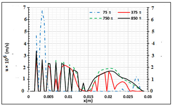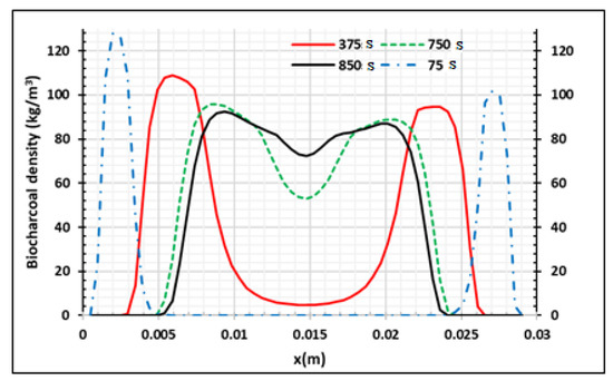 Figure 10 presents the evolution of the velocity of the gas in the sample during the process when the two main sides of the samples are heated at 973.15 K. We saw that this evolution is not regular and is lower than 7 × 10−6 m/s. When x = 0.03 m, we assume that the gradients of velocity and pressure are equal to zero, assuming that the samples are not permeable on this side. This condition permits the neglect of the flux of volatile products on this side (x = 0.03 m). Figure 11 presents the distributions of biocharcoal during the process according to the wood thickness when the temperature of the oven is equal to 973.15 K. The biochar is produced from the surface to the core of the wood samples. When the process continues, charcoal is produced in the center but transformed into other products around the surface of the product. Only 5 mm of each side is destroyed.