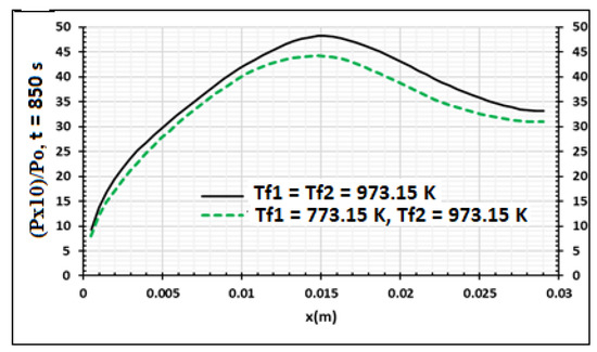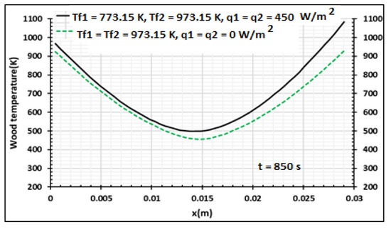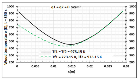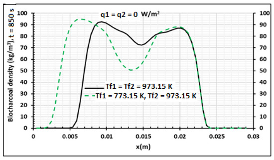 In Figure 12, Figure 13 and Figure 14, the side x = 0.0 m and side x = 0.03 m are respectively heated at Tf1 = 773.15 K and Tf2 = 973.15 K, but the heat flux density is equal to zero. This non-symmetrical heating is compared to symmetrical heating when the heat flux density is equal to zero. Figure 12 presents the wood temperature evolution at 850 s. As shown in Figure 13, when the temperature increases, the pressure of volatile products also increases in all thicknesses of the samples. The pressure fraction increases from the surface to the center. In effect, as showed by Zeng [41], temperature evolution in the product decreases when the wood pressure increases. Figure 14 shows that when the temperature increases, the biocharcoal production also increases, but a part of the biocharcoal near the surface is also transformed into other products, such as ash. Thus, it is clearly important to have a temperature where the produced biocharcoal is optimal.