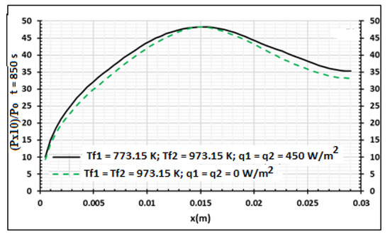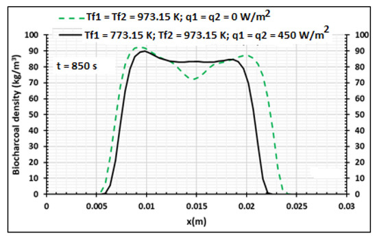Figure 15, Figure 16 and Figure 17 present the influences of temperature and heat flux density on the pyrolysis process and the produced biocharcoal. A comparison is done with the case where the heating is symmetrical and flux heat density is equal to zero. This comparison is done when the processing time is 850 s. Figure 15 shows that the heat flux density increases the value of the temperature on all the thicknesses of the sample. This heat flux density also influences the pressure of the volatile products produced during the pyrolysis process, as shown in Figure 16. Figure 17 showed that the heat flux density influences the production of biocharcoal. When the heat flux density increases, the production of biocharcoal in the inner portion of the sample also increases, but the destruction of the biocharcoal on the surface of the sample is progressive. Cai et al. [42] had obtained the same evolutions of the pressure during the pyrolysis process and concluded that to optimize the production of biochar, the pressure fraction during the process must be weak. Thus, they found that combustion reactivity decreased during hydro-pyrolysis at pressure up to 40 atm and increased at pressures above 40 atm [42]. Sha et al. [43] had noted the decrease of combustion reactivity as pressure increases. Thus, it is clear that the parts in Figure 13 where pressure is high (in the center of the product) have more biochar than the parts where the pressure is weak. Figure 14 confirms this perception, because the density of the biochar is higher in the center of the product than in the surface where the combustion process is high. Figure 15, Figure 16 and Figure 17 confirm the results obtained by Cai et al. [42], Sha et al. [43], and Van Heek and Mühlen [44] for inert conditions of pyrolysis. Variation of pressure must be integrated during the pyrolysis process, because many models did not take into account the effect of pressure during pyrolysis [45].