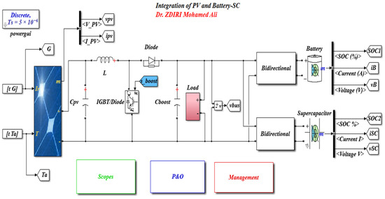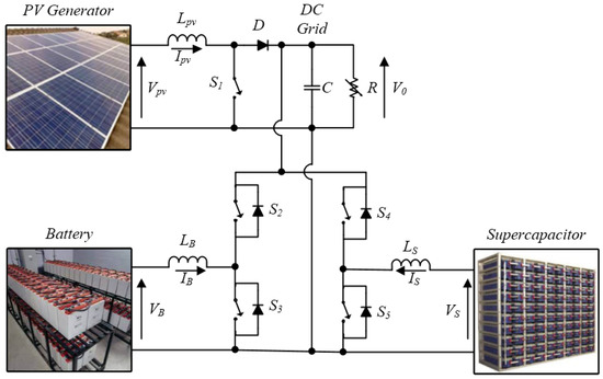 This buck-boost converter is utilized to enhance electrical energy flow between the HESS and the DC electrical grid. In the present study, the RAPSA’s total load is introduced as an equivalent DC load with resistance R. The PV, lithium-ion battery, and super-capacity modeling are presented and discussed in several research papers [24,39].