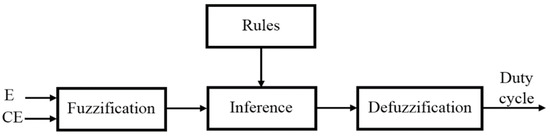 The FLC is deployed to regulate the PV generator using data knowledge [39,40]. This FLC module involves the fuzzification, decision making, and defuzzification phases. Figure 2, below, depicts the FLC block structure, wherein, ,, and the duty cycle designate the FLC inputs and output. The following equation depicts the FLC inputs: