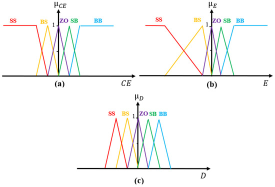 - Fuzzification: The fuzzification process entails that every variable used to define the control rules need be described by the fuzzy set notations and linguistic labels. Figure 3, below, highlights the MFs of the input and output variables. Each MF comprises five fuzzy sets: SS, BS, ZO, SB, and BB (S and B represent low and high, respectively).