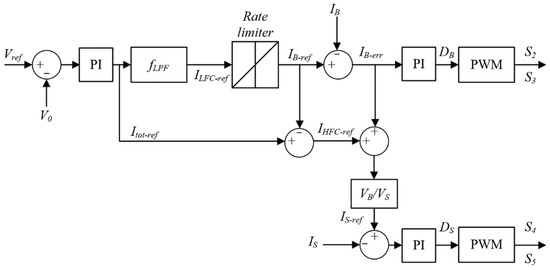 The conventional strategy is described through Figure 4 [41]. The major idea of this management approach consists in enhancing the lithium-ion battery lifetime by reducing the charging- and discharging-associated stress. In this study, the average voltage value is compared to the reference voltage (), while the error is received by the PI controller. The PI controller of the ESS generates the entirety of current amount required. The current is separated into low/high frequency components. The low-frequency component is depicted through the following expression: