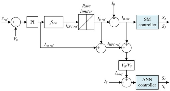 The block diagram of the improved HESS control strategy is presented in Figure 5, below. The suggested control strategy represents an improved version of the method put forward in [41]. In effect, the conventional strategy relies heavily on the PI controller to maintain commutation of the switch. However, the PI controller is not without any drawbacks, which reside mainly in the high initial overshoot, sensitivity to controller gains, and slow response to unexpected disturbances. As to our proposed system, it is designed to maintain a significant power flow and control, and to respond effectively to sudden climatic condition and load variations. For this reason, we consider incorporating intelligent controllers into the proposed strategy to help overcome the classical controllers encountered problems, mainly those associated with the switching problems.