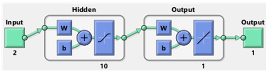 The ANN model is established by means of the MATLAB/Simulink environment. Figure 7, below, illustrates a feedforward NN model with two neurons in the input layer, ten neurons in the hidden layer, and a single neuron in the output layer. The Levenberg–Marquardt algorithm has been utilized to train a set of duty cycle data points based on simulation.