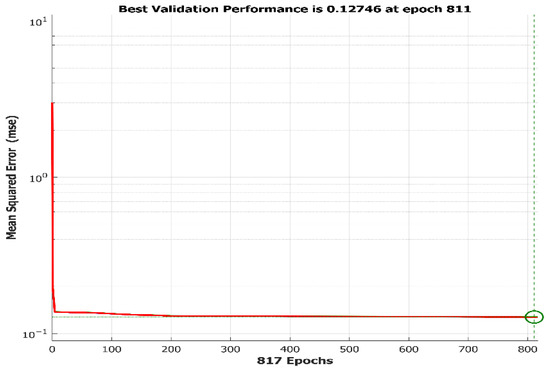 It is also worth underlining that the training performance curve, as appearing in Figure 8, below, illustrates that the MSE attained error is of the rate of 0.127 after 811 epochs.