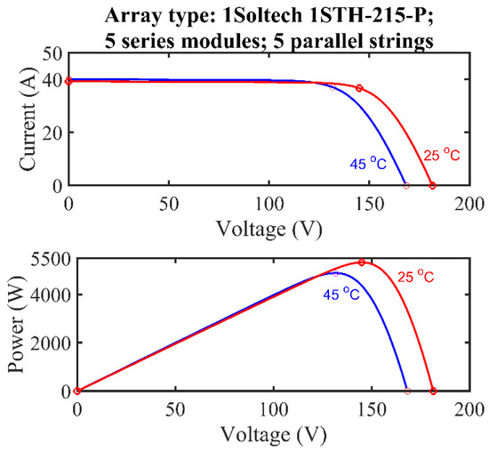 On executing the present work, a PV generator of 5329 W power is applied. The generator englobes four modules connected in series with four parallel strings. With reference to Figure 10, the adapted PV array type is the 1Soltech 1STH-215-P. The entirety of the designed HESS control system’s parameters figure on Table 3.