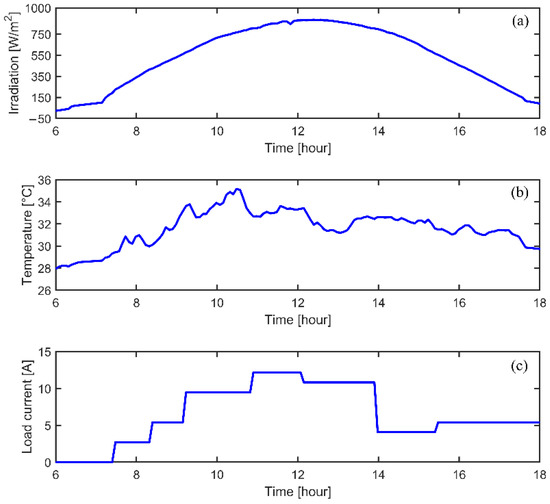 Climatic-condition and load-current variations observed over a 6–18 h span. Legend: (a) irradiation; (b) temperature; and (c) load current.