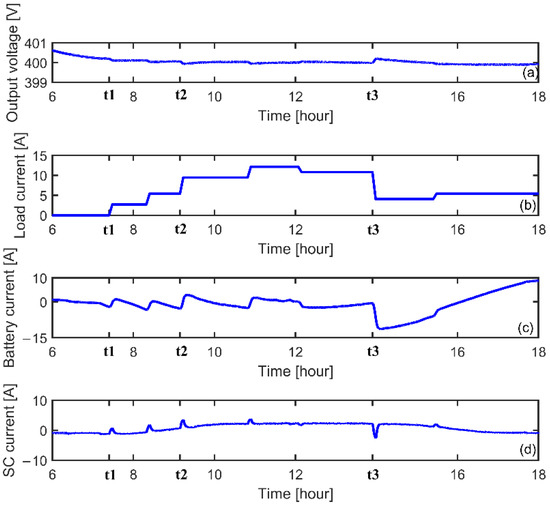 Figure 13, below, depicts the PV system as observed under climatic condition as well as load variations. Judging by Figure 13, and considering the instants t1, t2, and t3 characterized with noticeably high weather condition and load variations, one can well confirm and testify the investigated method’s robustness in terms of output voltage, which still proves to be equal to the reference voltage level (400 V), as depicted in Figure 13a. Noteworthy, also, is that the load’s high and low variations are characterized with a great increase and decrease in the load current, respectively, as depicted in Figure 13b. Indeed, the DC voltage peak variations are equal to approximately 1% of the reference voltage. Accordingly, the level of the continuous bus voltage fluctuations remains relatively acceptable and does not seem to affect the accuracy of the investigated HESS control strategy. When demand is unexpectedly reduced, for instance, at the instant t3, the output voltage turns out to be proportionally increased. Based on Figure 13c,d, however, and for the sake of maintaining the output voltage at a 400 V level, the super-capacitor undertakes to momentarily absorb the high-frequency component of excess supply, while the lithium-ion battery current takes a longer lapse to reach a stable state [44,45]. Indeed, the rate of the battery’s charging current is very low. It is also worth noting that the lithium-ion battery’s current stress is still remarkably minimal, meaning that it contributes in enhancing the battery’s life span, as compared to the other energy-management schemes.