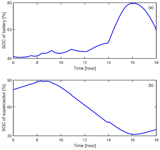 Simulation results of the SC and battery SOC. Legend: (a) battery SOC; and (b) SC SOC.