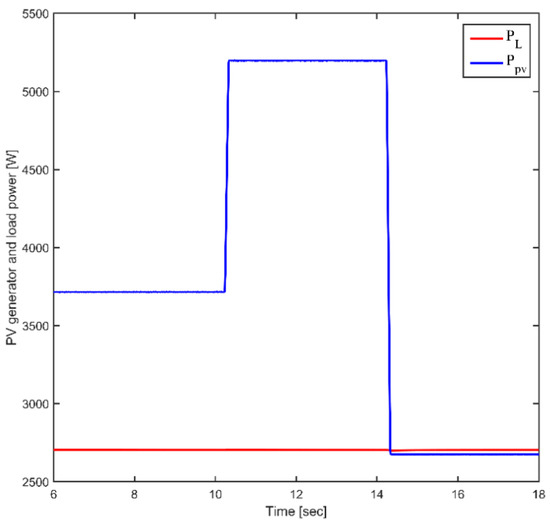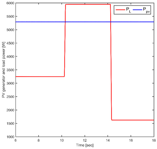 To compare the proposed method’s performance and that of the conventional method, irradiation increase and decrease step scenarios are selected, accounting for a temperature of 25 °C, as illustrated in Figure 15a,b, and a load power of 2703 W, as depicted in Figure 16, wherein the PV tends to vary with variations in climatic conditions.