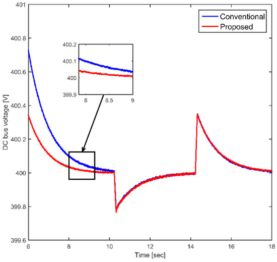As illustrated through Figure 17, both methods’ DC bus voltage simulation results are depicted. They illustrate well that the continuous bus voltage tends to increase and decrease proportionately to the increase and decrease in the PV generator’s power. Actually, the super-capacitor’s supply and demand surpluses are momentarily absorbed to continuously maintain the bus voltage at a 400 V level, as illustrated through Figure 17. The low-frequency component is diverted to the battery, thereby, maintaining current stress at a noticeably low level. According to the already displayed results, the designed HESS control strategy appears to offer rather prompt voltage regulation and lower oscillation (zoomed output voltage) than the conventional HESS control strategy.