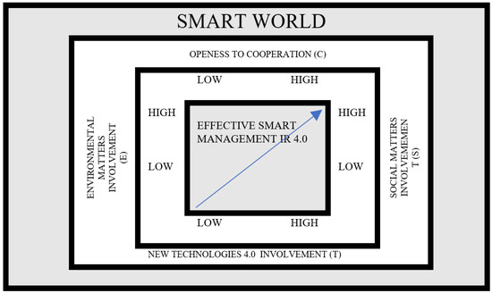 Unfortunately, being SMART today more and more obliges you to do something more (see: Directory of Key Intelligence in the Industry 4.0 Era) [37]. SMART also means focusing on the creation and implementation of such proactive and innovative technological solutions that will shape ever-better quality, and at the same time more humane and environmentally sustainable conditions for social and economic functioning. They should create consciously integrated cyberspace and social hyperspace, using comprehensive interconnections, physical perception intelligence, cyber interactions, social correlation and cognitive thinking across all aspects of everyday life [38,39,40]. The development of the organization in accordance with the requirements of the SMART ORGANIZATIONS concept, therefore, generates the need for contemporary managers to pay more attention to environmental and social aspects, not only the technological [41,42]. This is connected to putting more emphasis on, e.g., the ethics of business activities, CSR and sustainable development, and within them, deepening the commitment to the ecology of production and production-related activities, investments in renewable energy sources, customer-oriented co-creation, etc. [43,44,45,46,47,48].