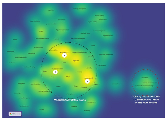3. The density of the network of links between individual keywords is highly varied, although the keywords “co-creation”, “Industry 4.0/Industry 4” and “value co-creation” are integrators of “networks of links”, symbolized by the color yellow (The larger the number of items in the neighborhood of a point and the higher the weights of the neighboring items, the closer the color of the point is to yellow. The other way around, the smaller the number of items in the neighborhood of a point and the lower the weights of the neighboring items, the closer the color of the point is to blue—bottom map A, B, C).