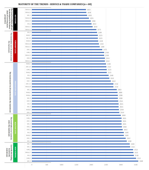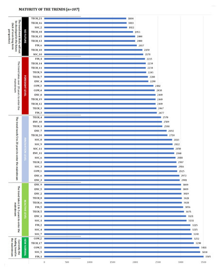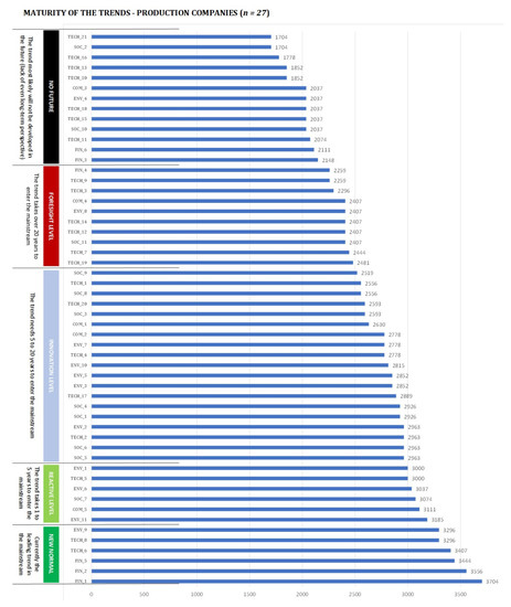 Bearing in mind the above, it should be emphasized that the changes observed in the above areas are only the tip of the iceberg. For several years, scientists and specialists have been conducting research on various aspects and symptoms illustrating the changes taking place thanks to the digital revolution of Industry 4.0. One of the many very interesting concepts is the constantly updated concept of the so-called “trend maps” prepared by the Infuture Institute [123]. This map is a proprietary tool that collects knowledge about the threats, challenges and opportunities related to Industry 4.0. The map shows five groups of trends (trends in the area of technology, economic, environmental, social and communication) aggregating a total of 54 specific trends in the latest edition of the map for 2021. Each of them is placed in a zone indicating the level of its maturity (four maturity zones: foresight, innovation, reactive and new normal)—the closer to the center of the pentagon, the more time the trend needs (according to the current state of knowledge and the pace of its development) to become the leading trend. The map analysis is designed to facilitate companies and organizations to work with trends, but also to feed knowledge and assist in making strategic decisions.