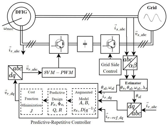 The closed-loop performance of this controller is established by the selection of the weighting matrices and . A complete block diagram of the predictive-RC applied to the double-fed induction generator is shown in Figure 1, here are depicted the transformation blocks, the space vector modulation, the proposed PRC, and the estimator, which is similar to the one proposed in [].