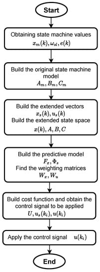 On the other hand, the model-based predictive control (MBPC) [] is an approach that uses a system model to calculate its future behavior and makes the obtention of the control law for the system possible [,]. There are countless predictive control techniques for DFIG reported in specialized journals, for instance, generalized predictive control (GPC), in this one, a transfer function is used as a system model to obtain the corresponding control law after minimization of a quadratic cost function [,]. MBPCs with nonlinear models [,], predictive control in continuous time [,,] or the finite control set [,,], and others [], are interesting approaches of this kind of control theory for the control of DFIG. Of all the diversity of predictive controllers, the linear state-space model presents some advantages such as a low computational cost when it is compared with other nonlinear models, for instance, its ability to deal with coupling components and flux components in a direct way, among others [,].