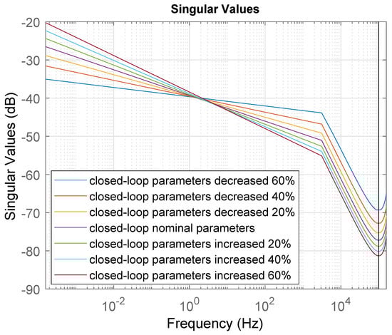 Singular values can be displayed for the closed-loop system, where it is possible to note that the plant plus the controller are stable considering the theory described in chapter 8 of []. Placing the resultant curves in the same figure allows confirming that the system is still stable. This is shown in Figure 3.