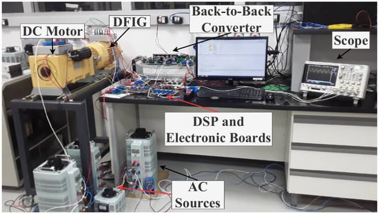 The experimental test bench where all the tests were performed can be seen in Figure 4, it consists of a DC motor that is mechanically coupled to a DFIG to emulate the wind speed, a back-to-back power converter was connected to the DFIG rotor windings and to the stator windings through the grid by means of a set of electrical contactors.