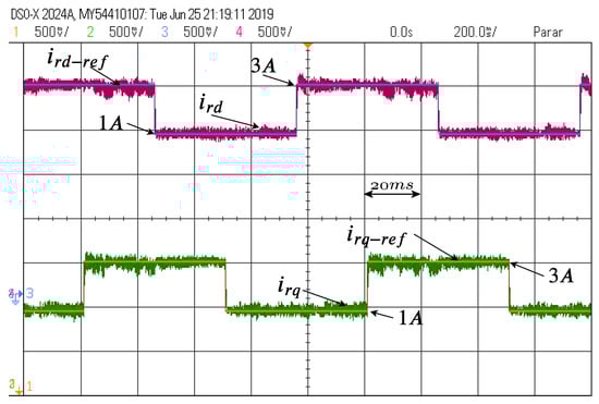 For the first test, a scenario with constant rotor speed equal to rpm was prepared, where the rotor currents (the controlled variables of the PRC) follow its references changing its values from 1 A to 3 A and from 3 A to 1 A. These changes in the reference values are not made simultaneously as can be seen in Figure 5. The real rotor currents manage to follow their respective references in an acceptable way. Furthermore, Figure 6 presents a detailed view of one rotor current step from 1A to 3A and it can be observed that there is a response without overshoot and a settling time equal to 1.25 ms, approx.