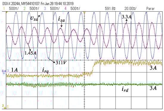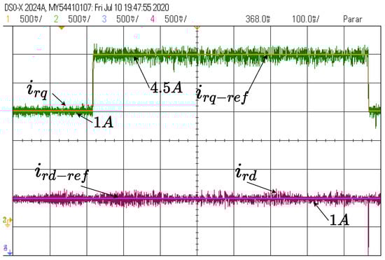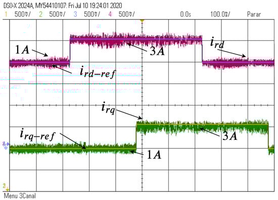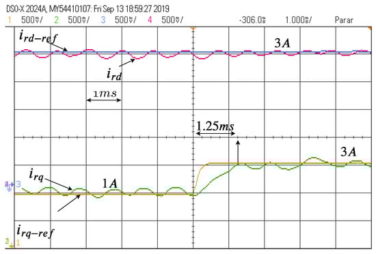 In this section, the same test presented in Figure 5 are reproduced considering , and in Figure 10. It can be noticed that the predictive-repetitive controller for DFIG rotor current control reaches the references and the steady state error is minor than 1% while the error in MPC presented in [,] is 1.5%.