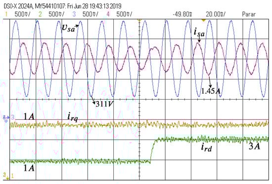 Analyzing the Figure 8, it can be observed that the rotor current is changing now from 1 A to 3 A, noticing that instead of changing the amplitude of the , what is changing now is the phase of this current. Just where the rotor current step change is occurring, an abrupt change in the phase of the stator current can be observed, which is maintained on the right side of the step. The behavior can be inspected in Figure 7 and Figure 8, confirming the theory discussed in [], according to that, a step change in causes a direct impact on active power and a step change in affects the reactive power , this is: and .