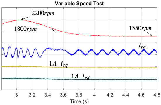 The second test carried out, was the imitation of a wind speed profile, using for that a DC motor mechanically coupled to the DFIG (as is depicted in Figure 4). The mechanical speed increases from a sub-synchronous speed of 1550 rpm, passing by synchronous speed (1800 rpm), up to a super-synchronous top speed of 2200 rpm to finally return to the initial sub-synchronous speed of 1550 rpm. Figure 11 shows the behavior of four variables: the mechanical rotor speed (, to show the wind speed profile), the rotor current of the phase A (, in the rotor reference frame) and the rotor current components in the dq reference frame (as the controlled variables). Figure 11 shows only the behavior of these four variables when the speed is going down. When this speed falls from 2200 rpm to 1550 rpm, a frequency inversion for phase A of the rotor current at a synchronous speed of 1800 rpm can be observed. This frequency inversion indicates the transition from super-synchronous to sub-synchronous speed and it is proportional to the slip speed .