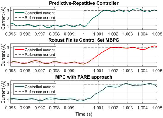 To address the analysis of the proposed controller performance in a deeper way, we used the performance of the robust finite control set [] and the performance of an MPC with a FARE approach [] for contrast purposes. All controllers were tuned with the aim of the best reaching for the reference signal, for a more detailed explanation of the controllers tuning methods, there are works such as [] that have as scope illustrates the tuning process, the results presented here are based on these methods to obtain a fair and easy comparison between controllers. Figure 12 compares the step response of the different strategies. Thus, the comparison was made with a step from 1 A to 3 A. It can be highlighted that the proposed PRC has a better performance due to its settling time being minor at more than 30% when compared with the other approaches. Additionally, the PRC proposed has a lower steady state error when compared with [] and [], as is presented in Table 1.